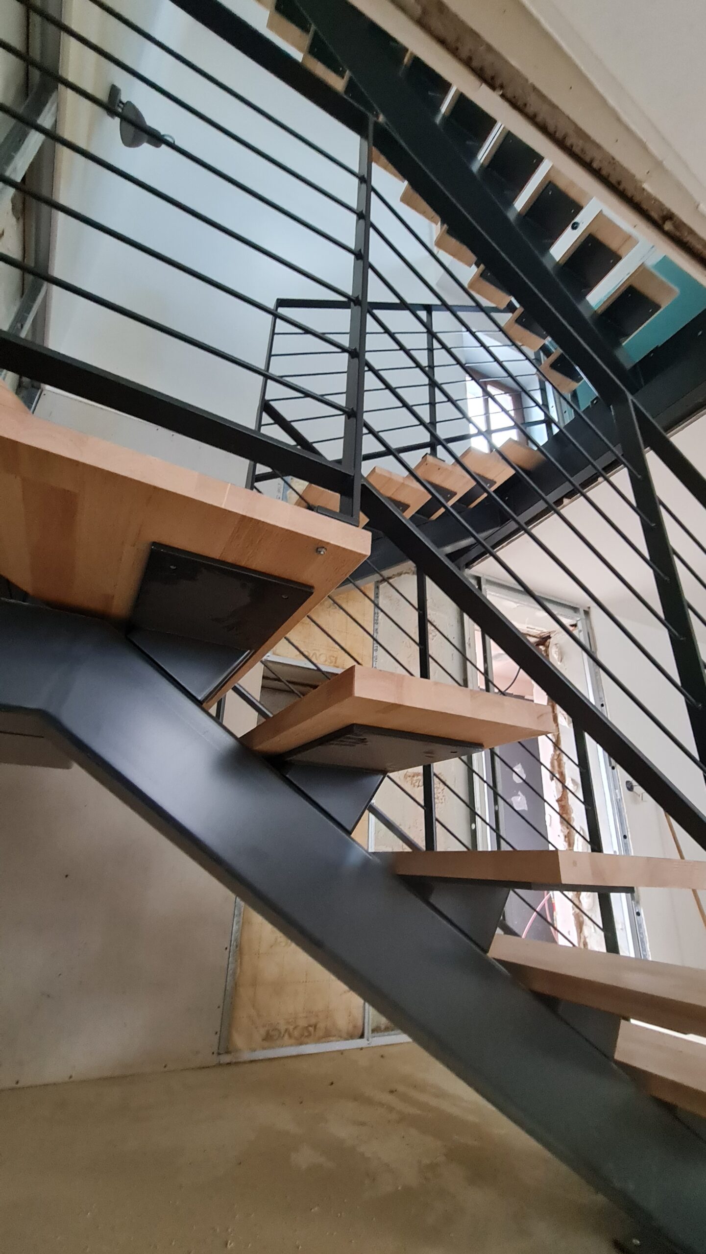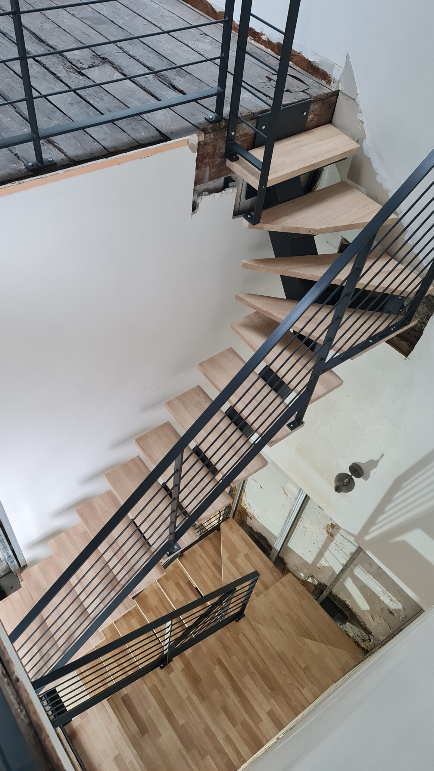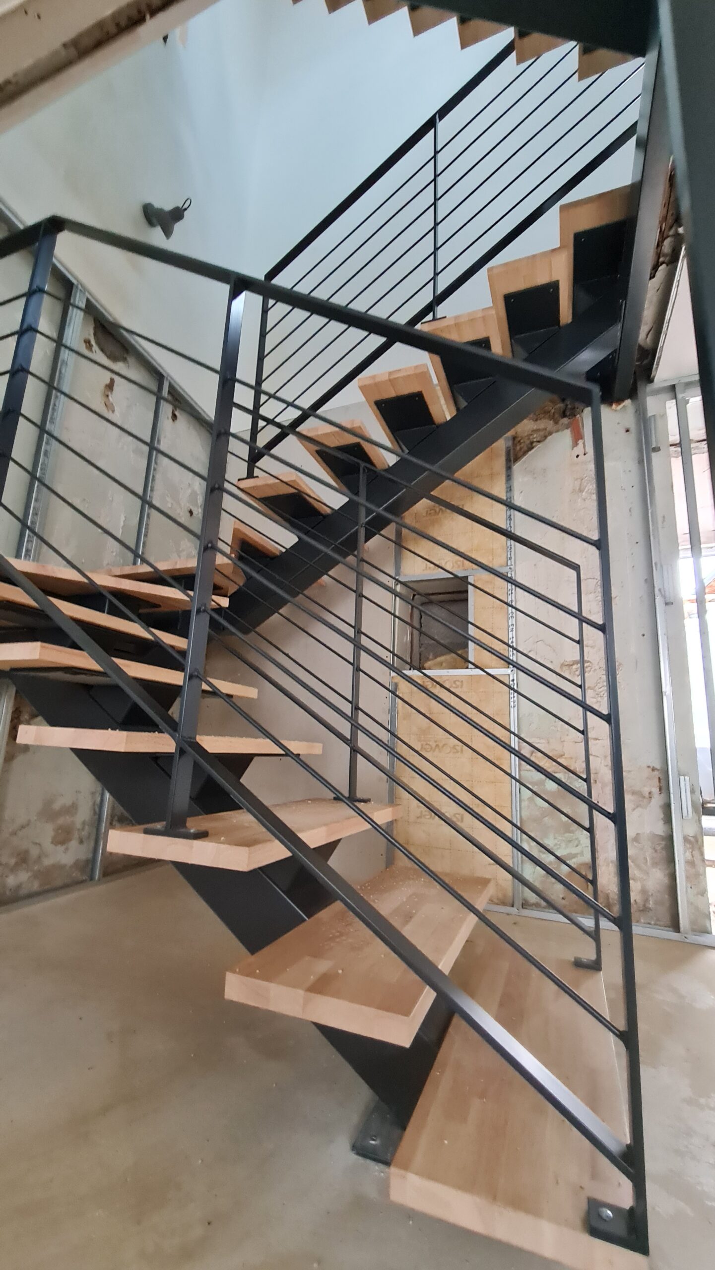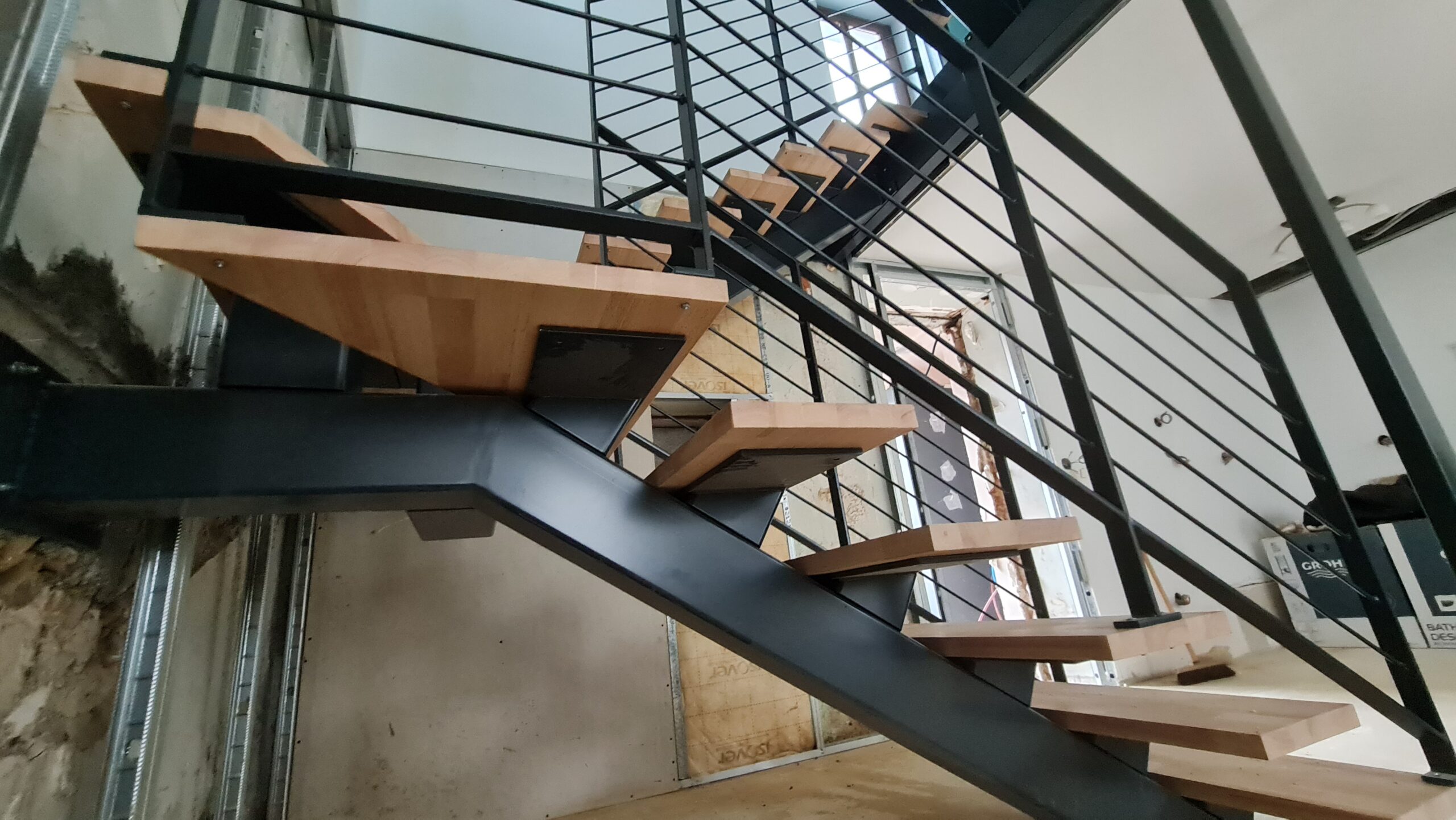 - Création d'un limon central en acier, poncé et verni incolore
