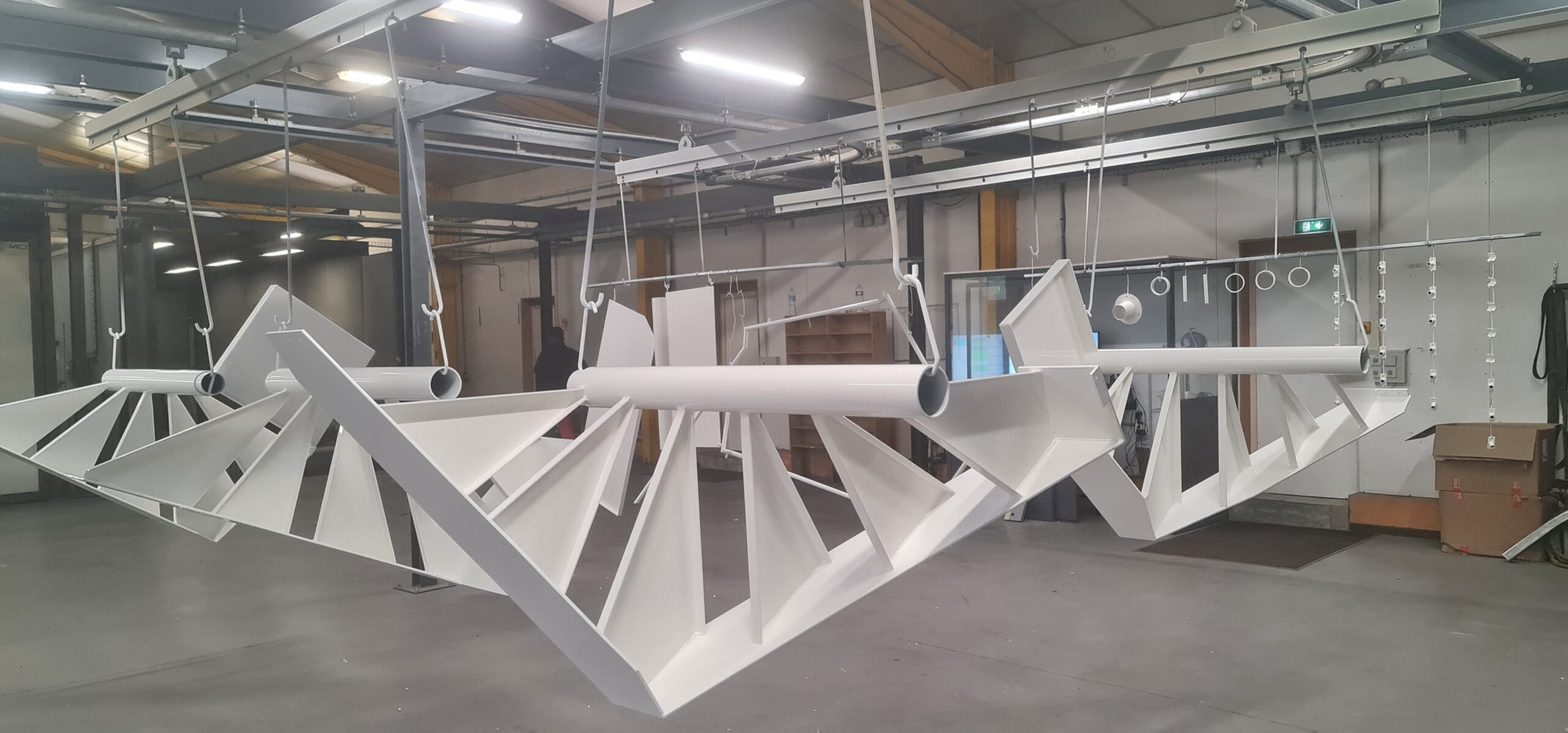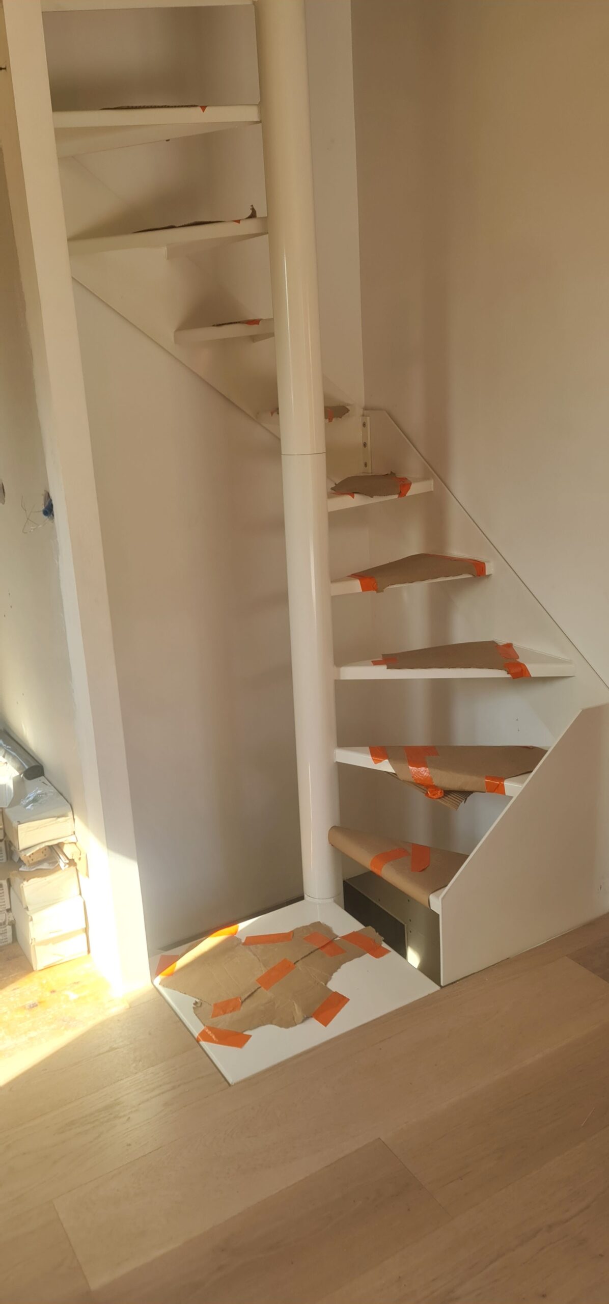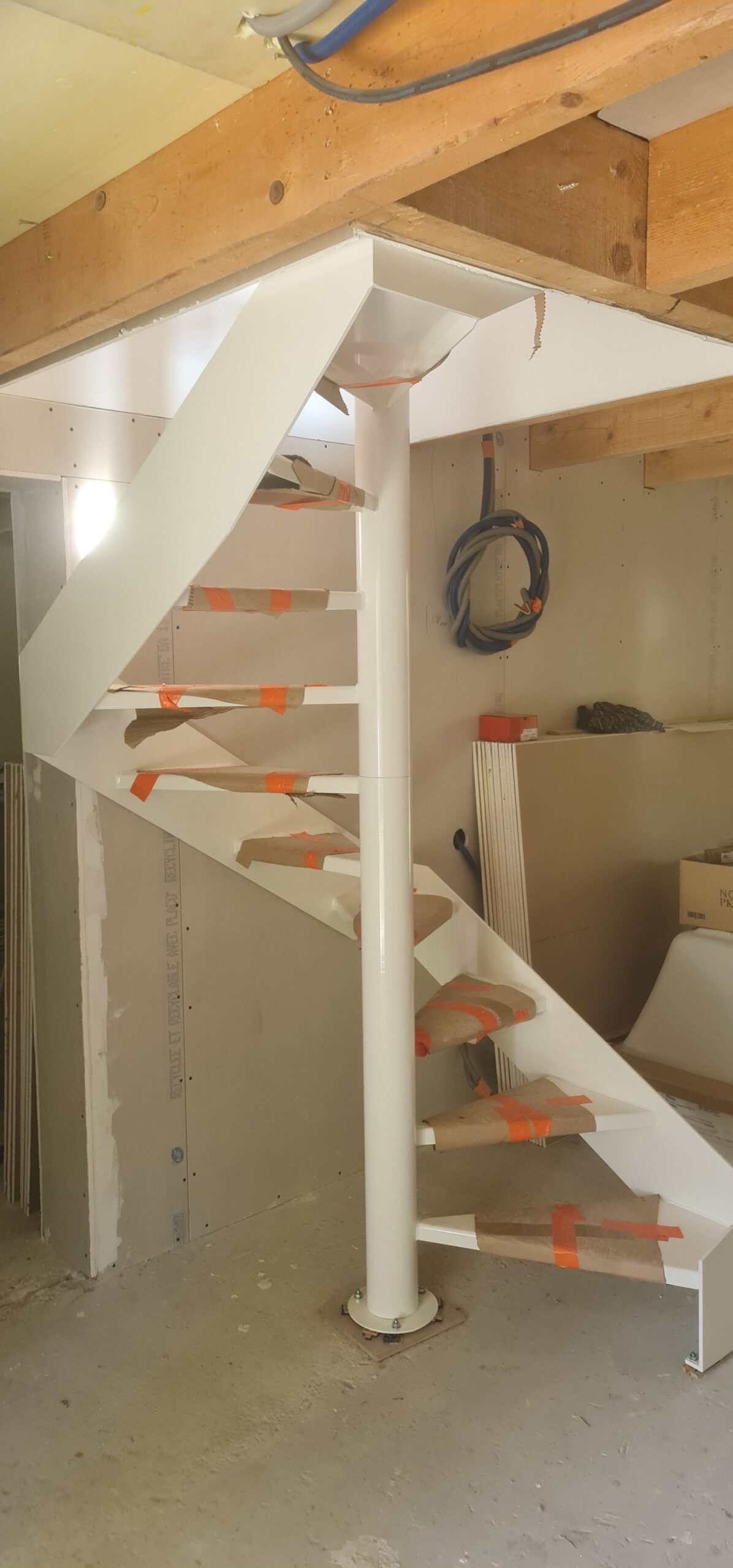 - l'escalier laqué chez notre prestataire de thermolaquage. Il a été réalisé en 3 pieces afin de pouvoir passer par la trémie du client pour le montage sur place