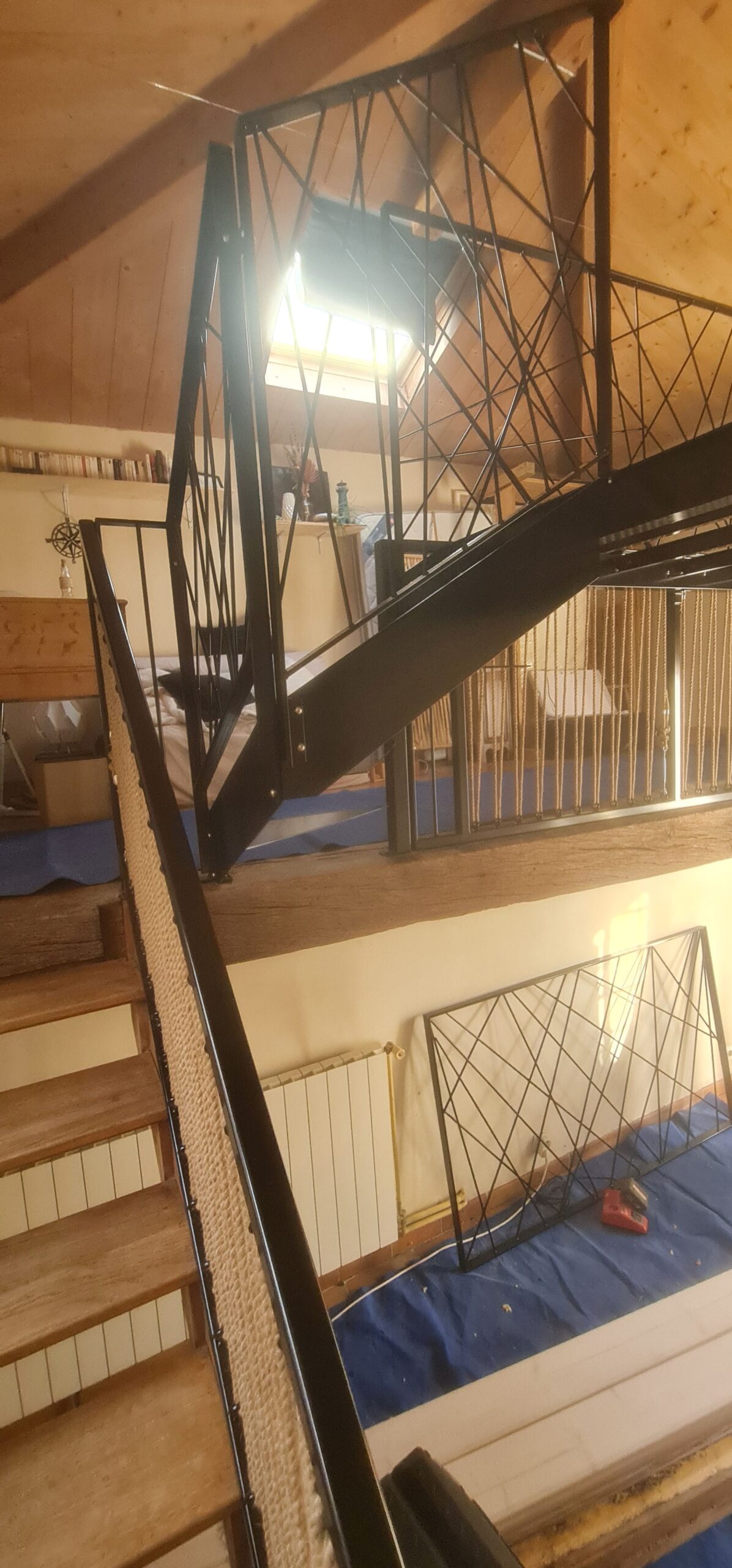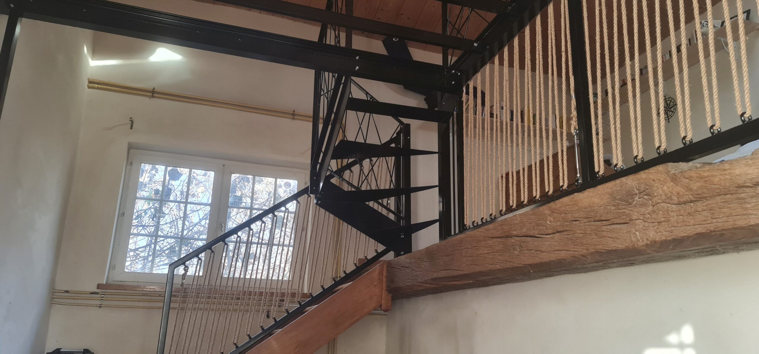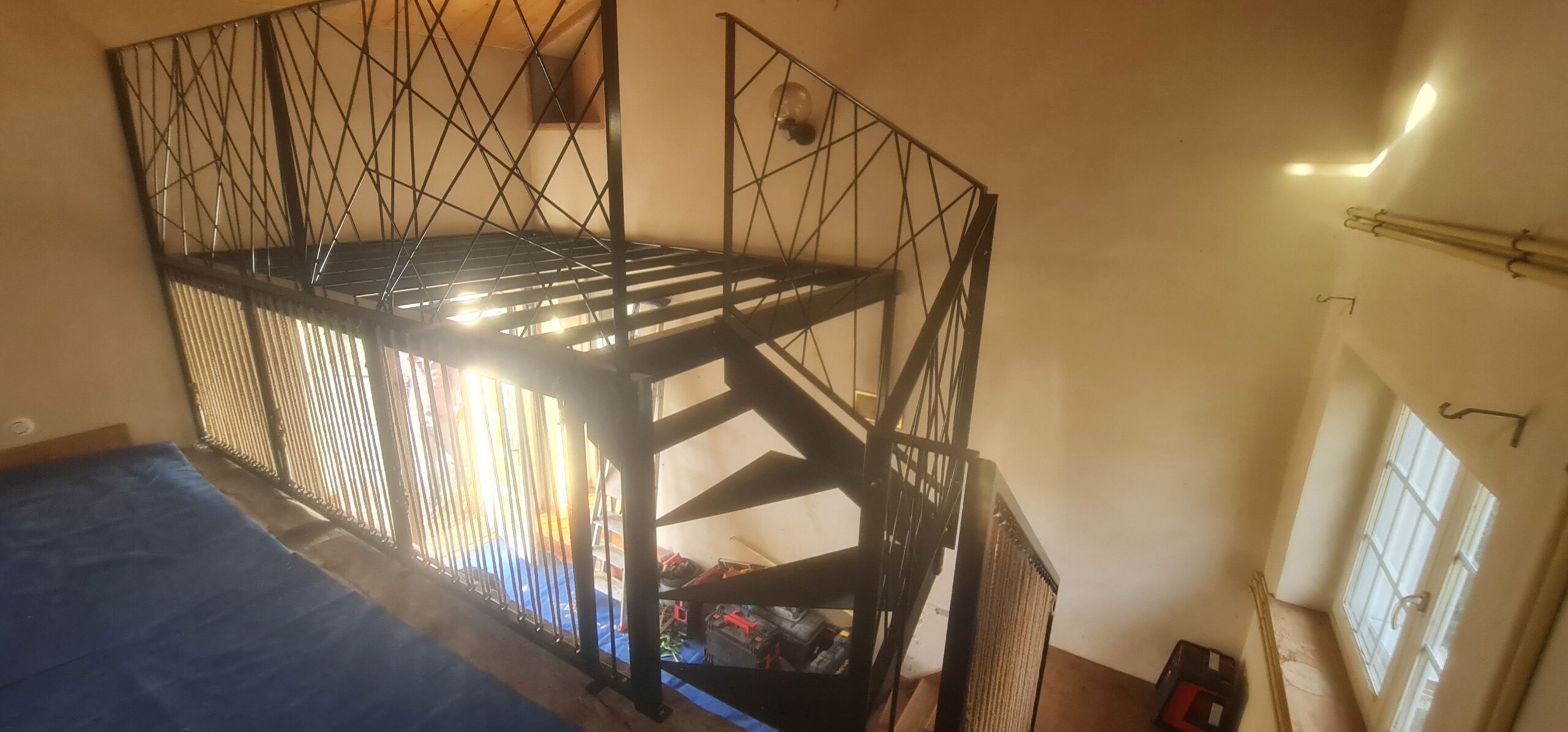 - réalisation de garde-corps sur 2 niveaux : le niveau bas est en remplissage avec des cordes et le niveau haut est en remplissage avec des tubes 8mm en pose aléatoire