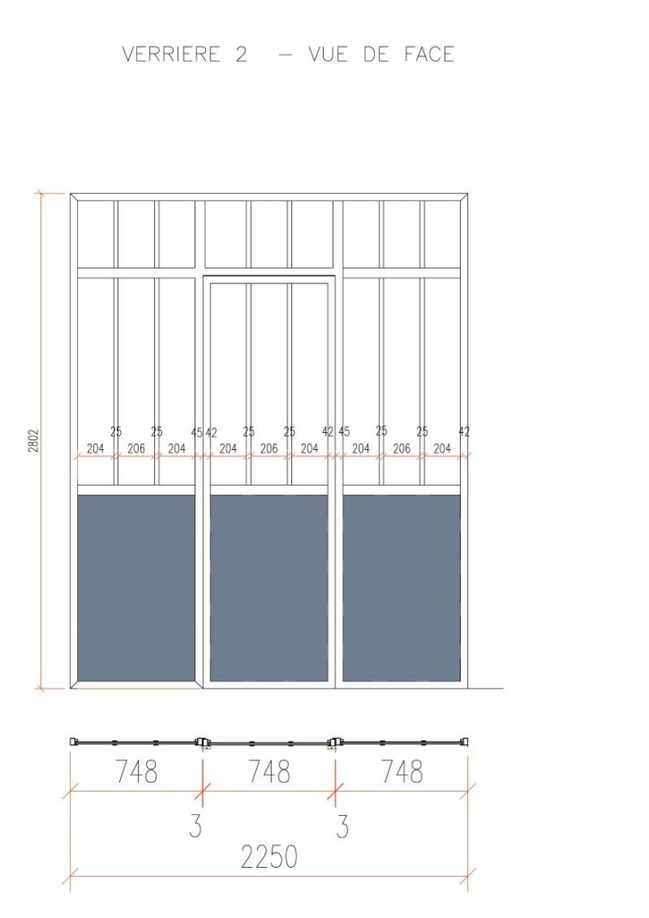 Ci-dessous : Plan de la verriere réalisée à Lyon avec 2 parties fixes à gauche et à droite et imposte fixe